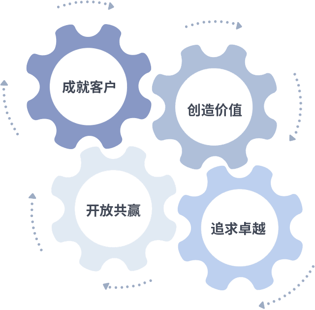 成就客户是一切决策的出发点,,,,创造价值是衡量所有工作的标准,,,追求卓越是我们做事做人的态度,,,,开放共赢是我们的格局也是最终的结果。。。价值观的齿轮环环相扣,,,,推动着组织里的每个人不断向前。。。。